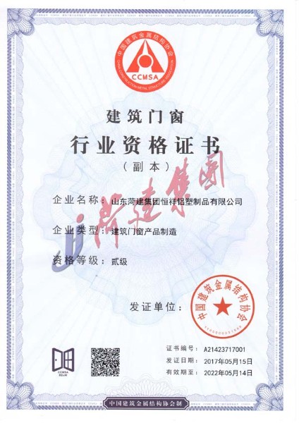 菏建恒祥鋁塑制品公司資質(zhì)等級成功晉升為貳級資質(zhì)