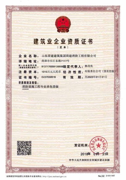 1月31日,經(jīng)山東省住房和城鄉(xiāng)建設(shè)委員會(huì)審核批準(zhǔn),集團(tuán)消防公司順利獲得消防設(shè)施工程專業(yè)承包壹級(jí)資質(zhì),為集團(tuán)公司發(fā)展壯大再添基石。