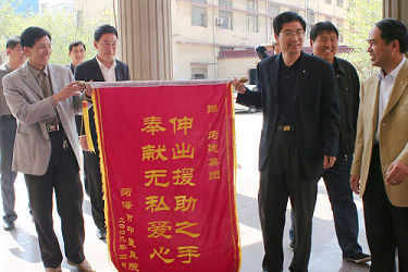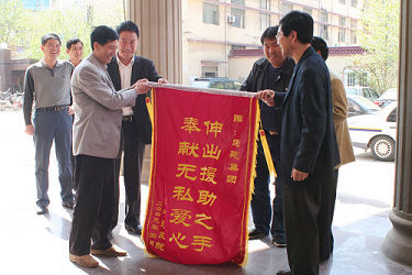 2009年4月21日上午10時(shí),菏澤市中醫(yī)院馬院長(zhǎng)和基建處長(zhǎng)、后勤主任一行三人專門來(lái)到菏建集團(tuán),將一面繡著“伸出援助之手,奉獻(xiàn)無(wú)私愛(ài)心”的錦旗送到菏建集團(tuán)領(lǐng)導(dǎo)手中,感謝菏建集團(tuán)又好又快建成的臨時(shí)病房。