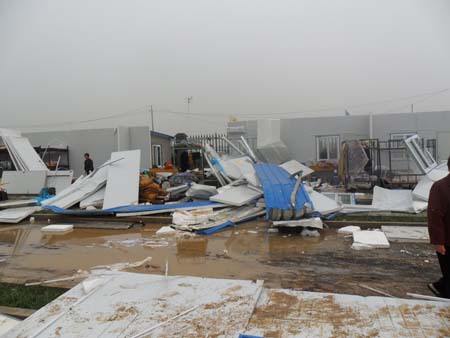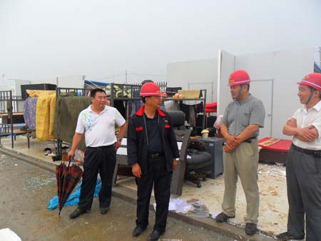 六月二十三日黎明五點左右,一陣突如其來的暴風雨襲擊了菏建集團承建的開封龍大工地,幾十間彩板房(近700余平方米)傾刻之間被大風從原地卷走,腰粗的高壓電線桿瞬間被折斷,造成大面積、長時間停電,勞累一天的工人們從夢中驚醒,部分工人的衣服被狂風卷到百米以外的田地里,當時天上還下著瓢潑大雨,衣服、被子等全部被雨鋟泡,項目經理朱茗同志從廢墟中摸出來后,首先察看大家是否受傷,把個別遭受輕外傷的工人進行簡單的包扎后,并立即帶領大家展開自救,對被淋濕的技術資料,圖紙及其他辦公用品進行妥善處理,把庫存成捆的工作服打開后及時發(fā)到工人手中,安排工人解決吃飯、住宿問題,對當天在工地住宿確實有困難的女職工聯(lián)系賓館,一切善后工作都在項目經理朱茗同志的帶領下有條不紊的進行著,同時將這次意外情況向集團公司分管領導進行了電話匯報。 集團公司分管領導及時向張廣周總經理作了匯報,張總經理馬上委托分管經理及安全部的同志趕赴工地,進一步了解具體情況……。
