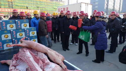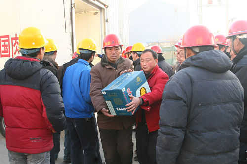 2011年1月1日上午,“元旦”之際,集團(tuán)黨委書(shū)記、董事長(zhǎng)兼總經(jīng)理張廣周帶領(lǐng)集團(tuán)領(lǐng)導(dǎo)、各部室負(fù)責(zé)人,先后到市政府(反恐)應(yīng)急中心及公安指揮中心、景岸家園和趙王河新村工地進(jìn)行慰問(wèn),為一線(xiàn)人員送去豬肉、煙酒。