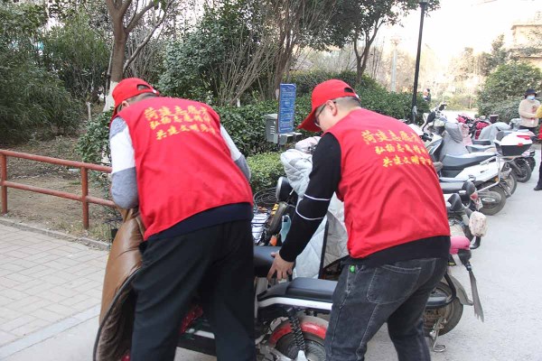 ![]() 志愿者將隨意停放的電動車、自行車移到指定位置擺放整齊 |