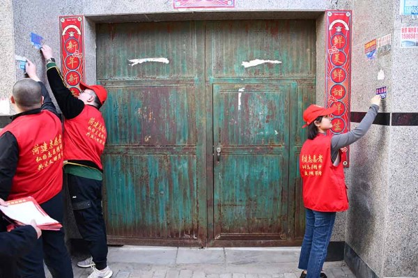 ![]() 志愿者清理亂貼亂畫的商業(yè)小廣告 |