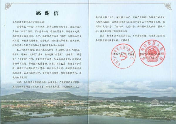 近日,中共棗莊市山亭區(qū)委、棗莊市山亭區(qū)人民政府向山東菏建國有資本投資有限公司發(fā)來感謝信,感謝菏建國投選派得力人員加入“四進”隊伍,對棗莊市山亭區(qū)經(jīng)濟社會發(fā)展給予了大力支持和關(guān)心幫助。