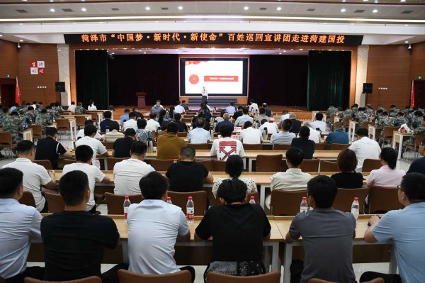 為推動黨的二十大精神在菏澤落地生根,激發(fā)全市廣大黨員干部群眾積極投身新時代社會主義現(xiàn)代化建設(shè),7月12日,菏澤市“中國夢·新時代·新使命”百姓巡回宣講團走進菏建國投開展宣講活動。市委宣傳部副部長、市新聞辦主任陳新振,市委講師團團長徐明軍,市委講師團副團長袁增華,市國資委二級調(diào)研員郭抒青,菏建國投黨委書記、董事長李信強,菏建國投黨委副書記、總經(jīng)理仝金安,市委宣傳部理教科科長萬偉等領(lǐng)導(dǎo)出席會議。菏建國投領(lǐng)導(dǎo)班子成員,國投機關(guān)全體人員,各權(quán)屬單位領(lǐng)導(dǎo)班子全體,菏澤市民兵應(yīng)急營一連、二連全體民兵參加會議。