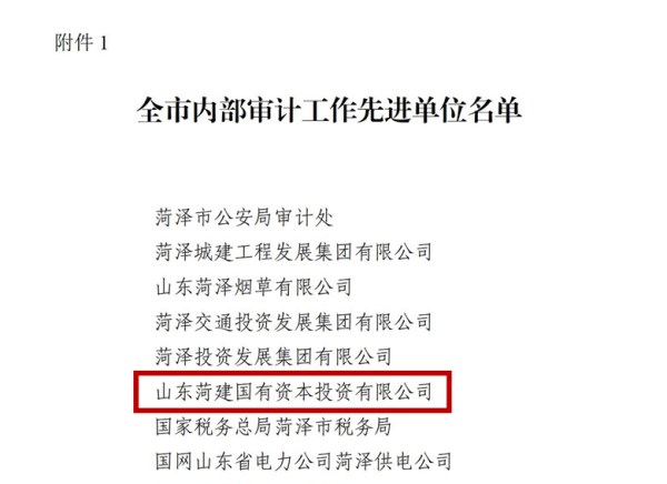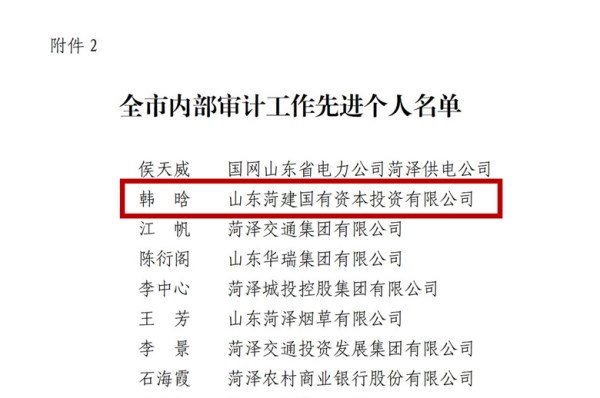 日前,菏澤市內(nèi)部審計(jì)師協(xié)會(huì)發(fā)布《關(guān)于表彰內(nèi)部審計(jì)先進(jìn)單位、先進(jìn)個(gè)人的通報(bào)》,菏建國投獲評(píng)2023年度“全市內(nèi)部審計(jì)工作先進(jìn)單位”,公司職工韓晗獲評(píng)“全市內(nèi)部審計(jì)工作先進(jìn)個(gè)人”。