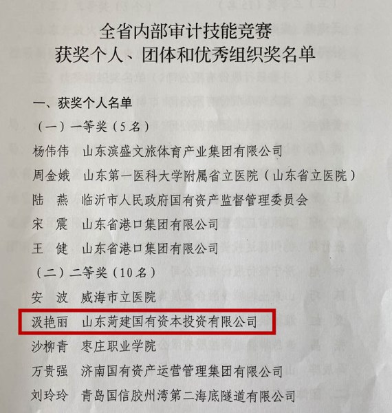 日前,由山東省審計廳、省人力資源和社會保障廳、省總工會聯(lián)合舉辦的2024年全省審計職業(yè)技能競賽圓滿結(jié)束。菏建國投審計法務部部長汲艷麗同志在52名決賽選手中脫穎而出,以總分第7名的好成績榮獲省內(nèi)部審計技能競賽個人賽二等獎。