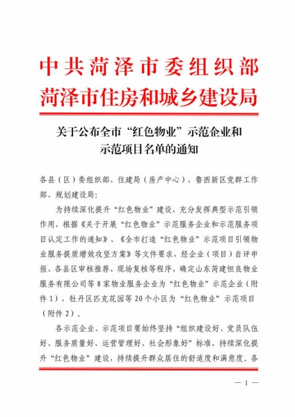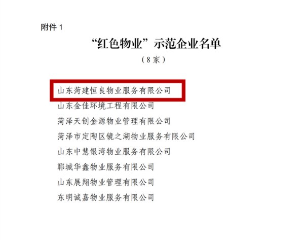 近日,市委組織部、市住房和城鄉(xiāng)建設(shè)局聯(lián)合發(fā)布文件,對全市紅色物業(yè)示范企業(yè)及示范項(xiàng)目進(jìn)行通報(bào)表揚(yáng)。山東菏建恒良物業(yè)服務(wù)有限公司憑借突出的黨建引領(lǐng)作用、卓越的服務(wù)品質(zhì)和顯著的工作成效,榮獲“紅色物業(yè)示范企業(yè)”稱號(hào);公司所管理的新河灣及賈宋莊項(xiàng)目,在眾多項(xiàng)目中脫穎而出,榮獲“紅色物業(yè)示范項(xiàng)目”稱號(hào)。