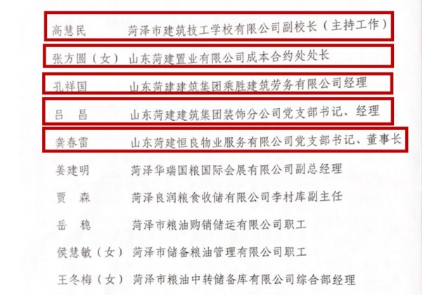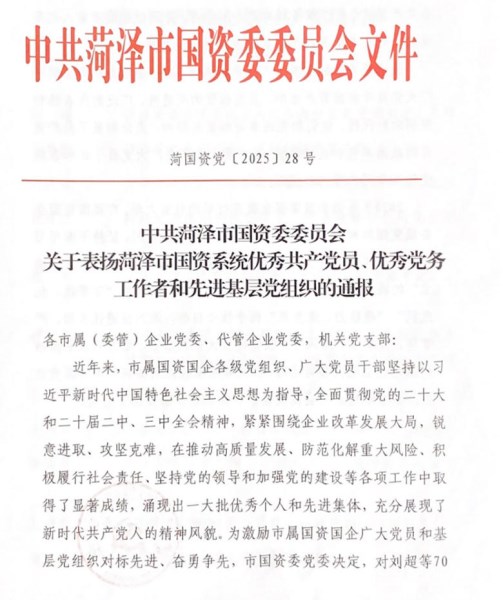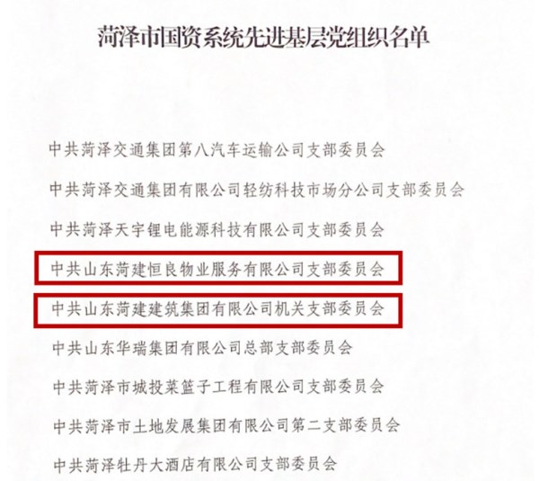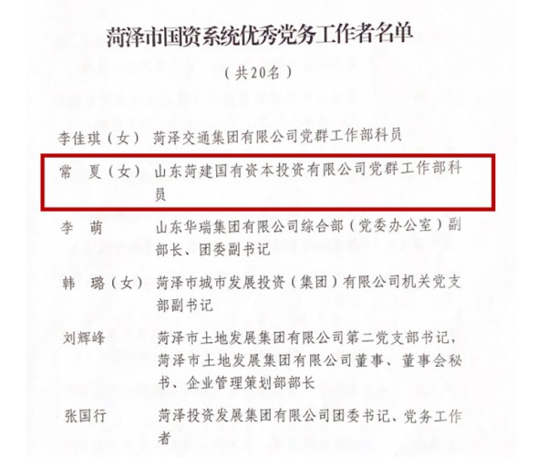 6月30日,市國(guó)資委印發(fā)了《中共菏澤市國(guó)資委委員會(huì)關(guān)于表?yè)P(yáng)菏澤市國(guó)資系統(tǒng)優(yōu)秀共產(chǎn)黨員、優(yōu)秀黨務(wù)工作者和先進(jìn)基層黨組織的通報(bào)》,張巖、高慧民、張方圓、孔祥國(guó)、呂昌、龔春雷等6人獲評(píng)“優(yōu)秀共產(chǎn)黨員”,常夏獲評(píng)“優(yōu)秀黨務(wù)工作者”,菏建集團(tuán)機(jī)關(guān)黨支部、菏建恒良物業(yè)公司黨支部獲評(píng)“先進(jìn)基層黨組織”。