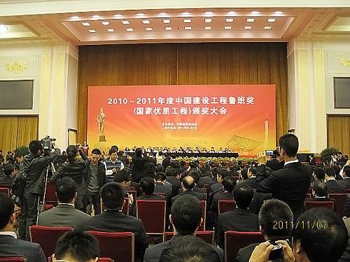 11月7日,莊嚴(yán)的北京人民大會(huì)堂里,承載著建設(shè)者光榮與夢(mèng)想的200尊魯班金像熠熠生輝,2010~2011年度中國(guó)建設(shè)工程魯班獎(jiǎng)(國(guó)家優(yōu)質(zhì)工程)頒獎(jiǎng)大會(huì)在這里隆重舉行。住房和城鄉(xiāng)建設(shè)部副部長(zhǎng)郭允沖,北京市副市長(zhǎng)陳剛,中國(guó)建筑金屬結(jié)構(gòu)協(xié)會(huì)會(huì)長(zhǎng)姚兵,中國(guó)建筑業(yè)協(xié)會(huì)特邀顧問(wèn)張百發(fā),住房和城鄉(xiāng)建設(shè)部有關(guān)司局、有關(guān)部門負(fù)責(zé)人以及各行業(yè)協(xié)會(huì)和有關(guān)部門代表共1200余人參加會(huì)議。市城鄉(xiāng)建設(shè)局局長(zhǎng)王乃光、市建管處副處長(zhǎng)孔繁東和集團(tuán)董事長(zhǎng)兼總經(jīng)理李信強(qiáng)、總工程師邵九憲、項(xiàng)目經(jīng)理南孟強(qiáng)參加大會(huì)并領(lǐng)獎(jiǎng)。