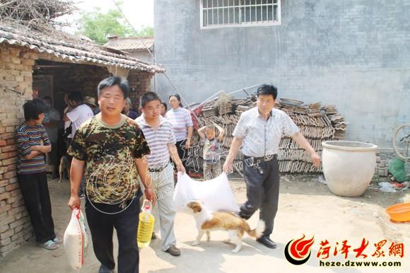 菏澤市委群工辦副主任張同信、菏建集團黨委副書記任永信為閆玉娥送上禮物和生活費