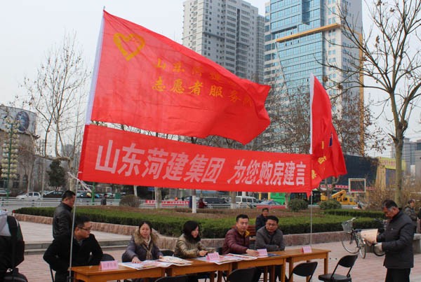 此次活動(dòng),集團(tuán)以“山東菏建集團(tuán)為您購房建言”為主要內(nèi)容,共展開涉及“購房咨詢、裝飾咨詢、房屋質(zhì)量咨詢、法律咨詢”等多個(gè)方面知識宣傳。三月的花都還是冷風(fēng)刺骨,集團(tuán)志愿者以專業(yè)的態(tài)度積極向過往的行人講解房屋相關(guān)知識,盡心盡力做好服務(wù)闡述雷鋒時(shí)代精神,用實(shí)際行動(dòng)展示出菏建人良好的社會形象。
